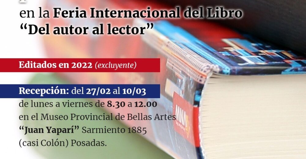 Recepción de librosDe tal modo, se invita a los autores que tengan libros editados en el año 2022 (este es un factor excluyente) a presentar dos ejemplares de cada uno de los título que deseen postular, para ser sometidos a un Comité de Lectura.Este comité es el encargado de seleccionar las obras que serán presentadas en el Día de Misiones en el marco de la Feria del Libro, buscando dar cuenta de la diversidad de géneros y abordajes literarios que hay en la provincia. El Comité estará integrado por representantes de instituciones de Letras y se ocupará de realizar la selección de autores.Los ejemplares entregados no se destinan al stand, sino que pasan a formar parte del acervo de la Biblioteca de autores misioneros “Daniel Stefani”, sita en la sala Maruja Ledesma del museo “Juan Yaparí”.La recepción se realizará del lunes 27 al viernes 10 de marzo, de lunes a viernes de 8.30 a 12.00 en el Museo Provincial de Bellas Artes “Juan Yaparí”, sito en Sarmiento casi Colón de Posadas. Quienes tengan dificultades para hacer el envío, pueden comunicarse con el director de Cultura correspondiente a su región: Lucía Mikitiuk (región Capital); Fausto Rizzani (región Norte), Florencia Monjes (región Río Paraná), Julio César Vázquez (región Río Uruguay) y Lorena Aguilar (región Sur).El Día de Misiones tendrá lugar el último fin de semana de la Feria.