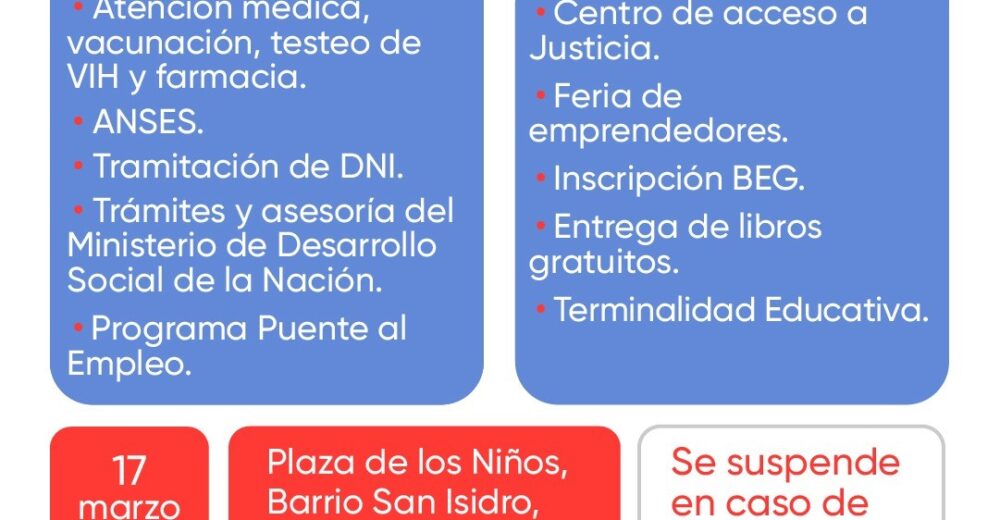 El Estado en tu Barrio es un programa que busca estar cerca de las personas que viven en distintos barrios de la ciudad, con operativos ubicados de manera estratégica, este jueves 16 y viernes 17 el operativo se llevara a cabo en el Barrio los Paraísos y Barrio el Barrio San Isidro de 8 a 13hsEl programa cuenta con tramites y asesoramiento del Ministerio de Desarrollo Social de la Nación, tramites de ANSES, tramites de DNI, tramites de terminalidad educativa. Los vecinos podrán acceder también a atención médica, brindada por el Ministerio de Salud, vacunación, testeos de VIH y fármacos recetados. Se pondrán a disposición libros y manuales escolares para los más pequeños. Se realizarán inscripciones al Boleto Estudiantil Gratuito.El principal objetivo de El Estado en tu Barrio es acercar soluciones a los vecinos de la Ciudad a través de diferentes servicios de manera rápida, sencilla y con profesionales de cada área para otorgar una específica atención.