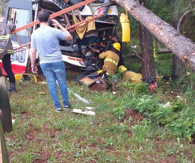 El siniestro vial ocurrió aproximadamente a las 11:30 horas de este jueves, en el kilómetro 1406 de la ruta 12 donde según los primeros datos obtenidos, un colectivo de media distancia que circulaba en sentido Iguazú-Posadas con 25 pasajeros, sufrió la explosión de un neumático, despistó al carril contrario, colisionó con un auto Fiat Qubo y terminó en la banquina impactando con árboles de pino.