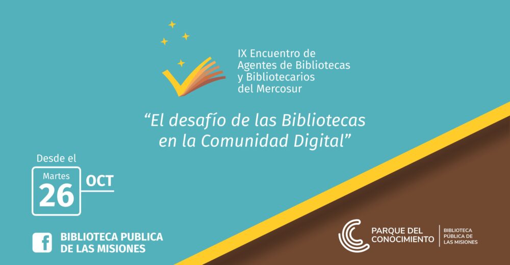 Con lema “El desafío de las Bibliotecas en la Comunidad Digital” y dentro del mes aniversario de la Biblioteca Pública De Las Misiones (24 de octubre), se realizará el IX Encuentro de Bibliotecarios y Agentes de Bibliotecas del Mercosur, los días martes 26, miércoles 27 y jueves 28, de manera virtual y con inscripciones vía formulario online: https://forms.gle/JY26sgPwXVjNmiJbA