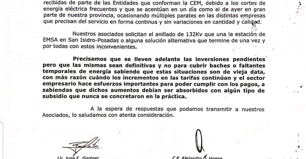 “Precisamos que se lleven adelante inversiones pendientes pero que las mismas sean definitivas y no para cubrir baches o faltantes temporales de energía de vieja data” afirman en el texto que sintetiza el reclamo de los asociados a la entidad gremial empresaria quienes además hicieron referencia a los costos que asumen en las facturas.