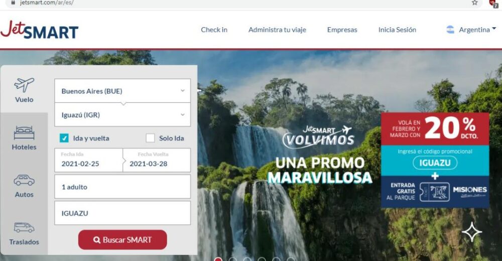 JetSMART además lanzó precios promocionales desde $3.299 pesos finales por tramo para viajar entre Buenos Aires e Iguazú para aquellos tickets adquiridos entre el 18 y el 29 de enero de 2021. Los pasajes pueden comprarse en www.JetSMART.com, en seis cuotas sin interés.