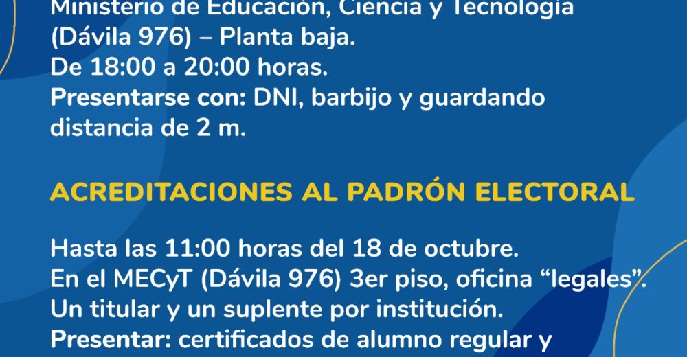 Las acreditaciones para formar parte del padrón electoral y emitir voto estarán abiertas hasta las 11:00 horas del 18 de octubre, en el tercer piso (oficina de “Legales”) de la misma dirección. Representantes de centros de estudiantes, y también instituciones que no cuenten con centros de estudiantes, deben presentar un titular y un suplente por institución, con certificado de alumno regular y nota firmada por un directivo.