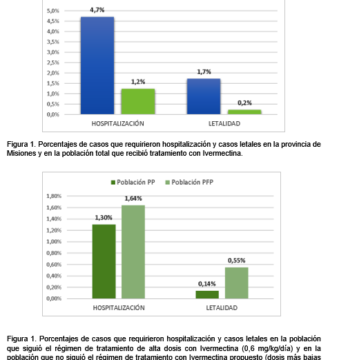 Así, se observa una disminución de 3,5 veces de los casos que requirieron hospitalización y una disminución de 1,5 veces los casos fatales, en la población que recibió tratamiento con Ivermectina (Fig. 1).